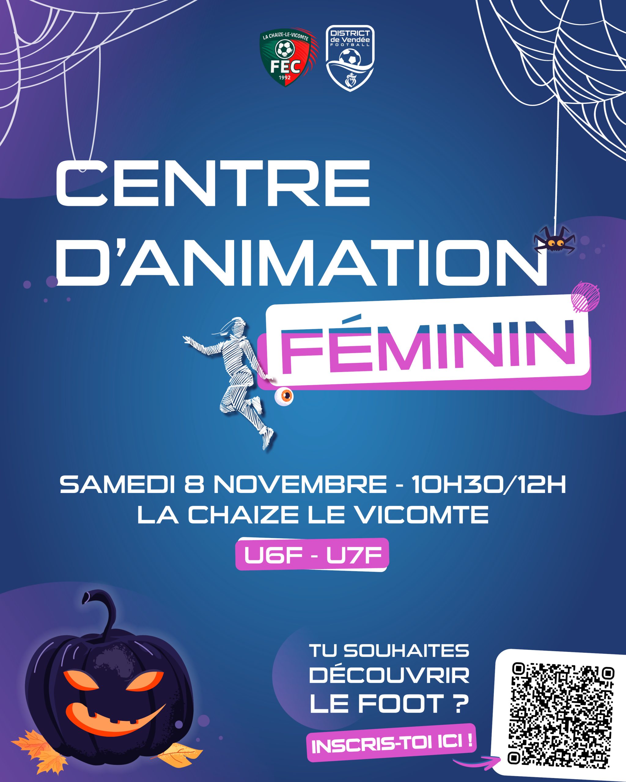 Pour son lancement, le premier Centre d’Animation Féminin aura lieu à La Chaize-le-Vicomte le samedi 8 novembre (10h30 – 12h) et sera destiné aux jeunes joueuses U6F-U7F (nées en 2019 – 2020) sur la thématique d’Halloween.
